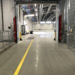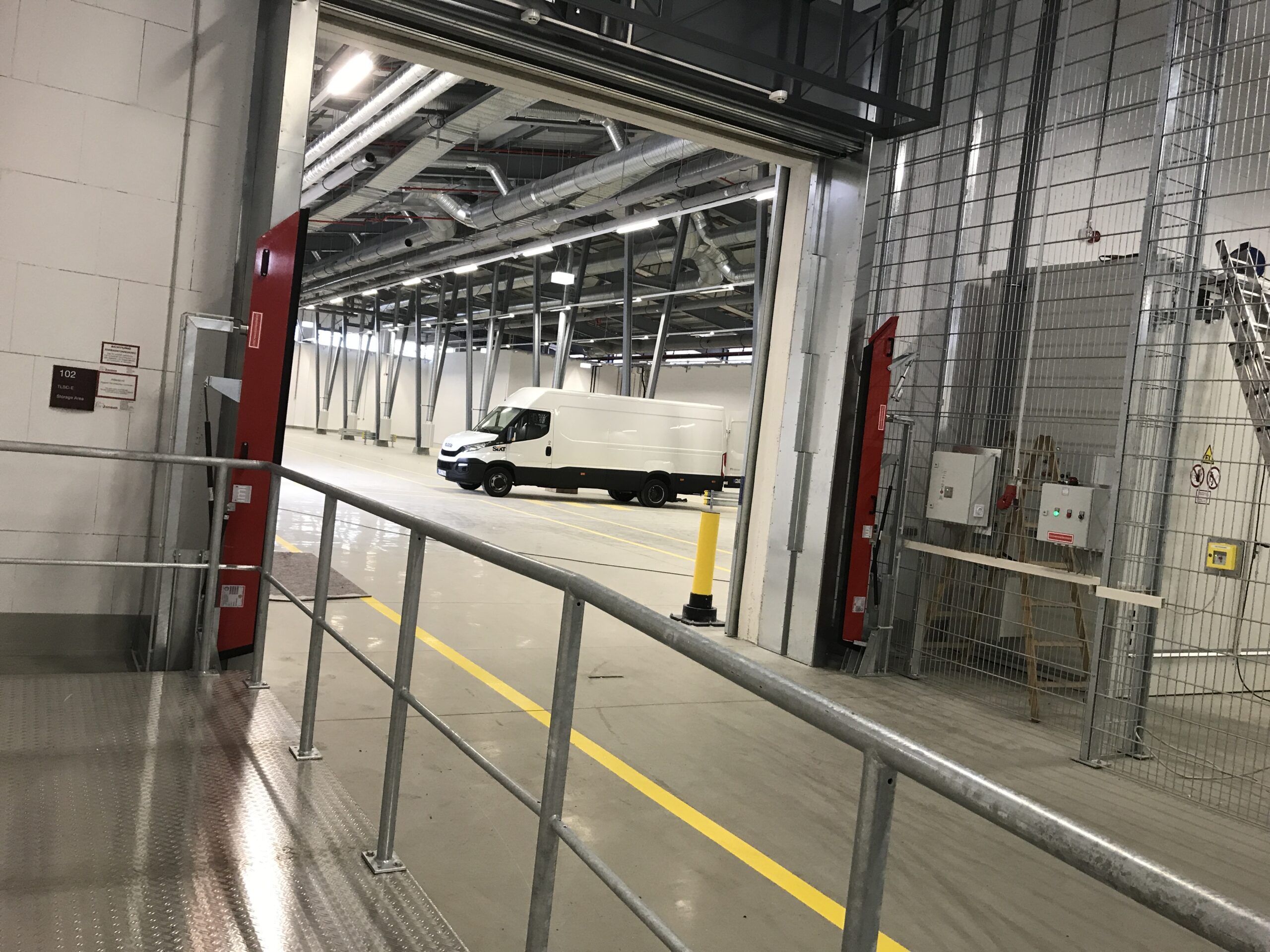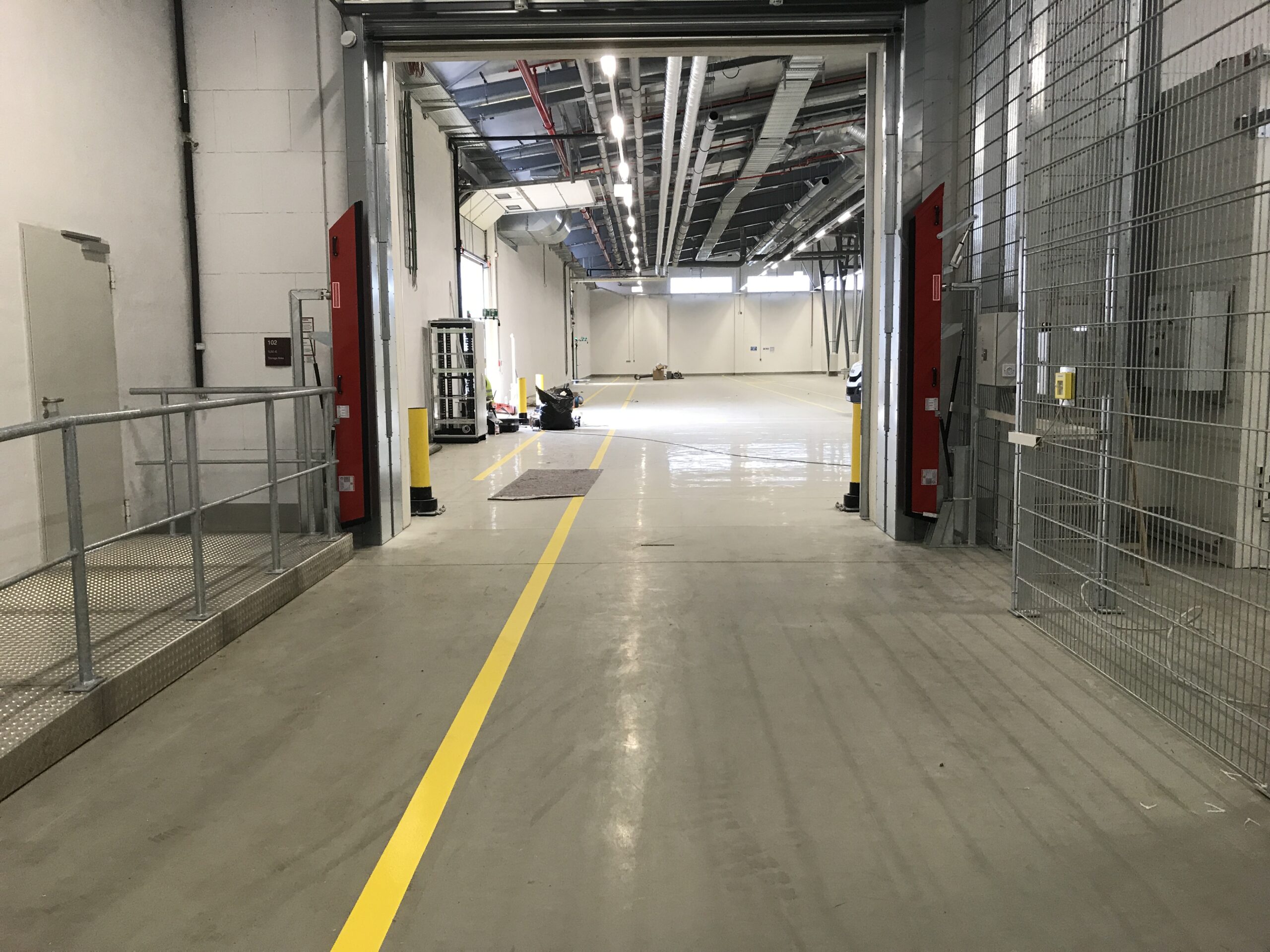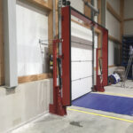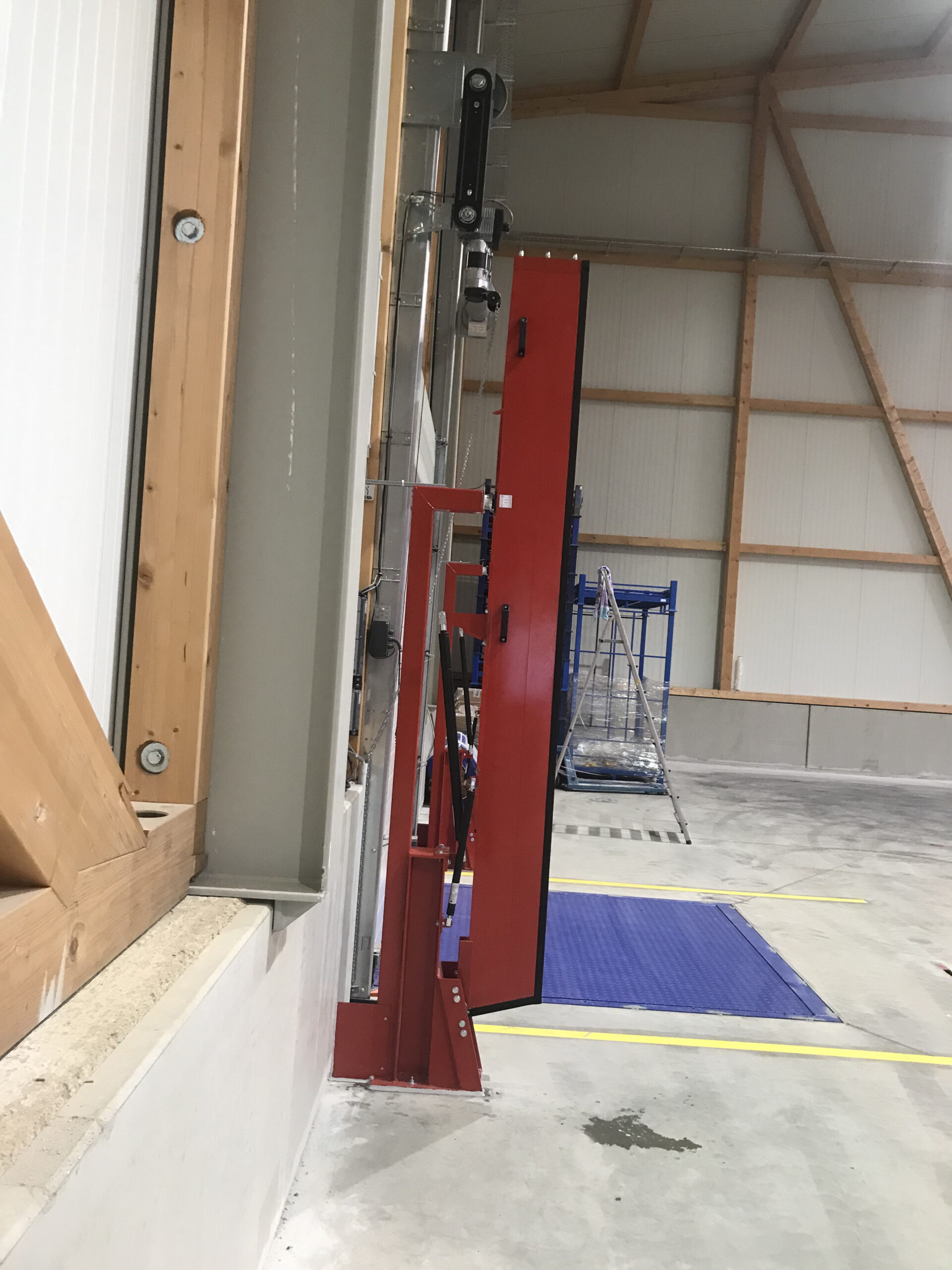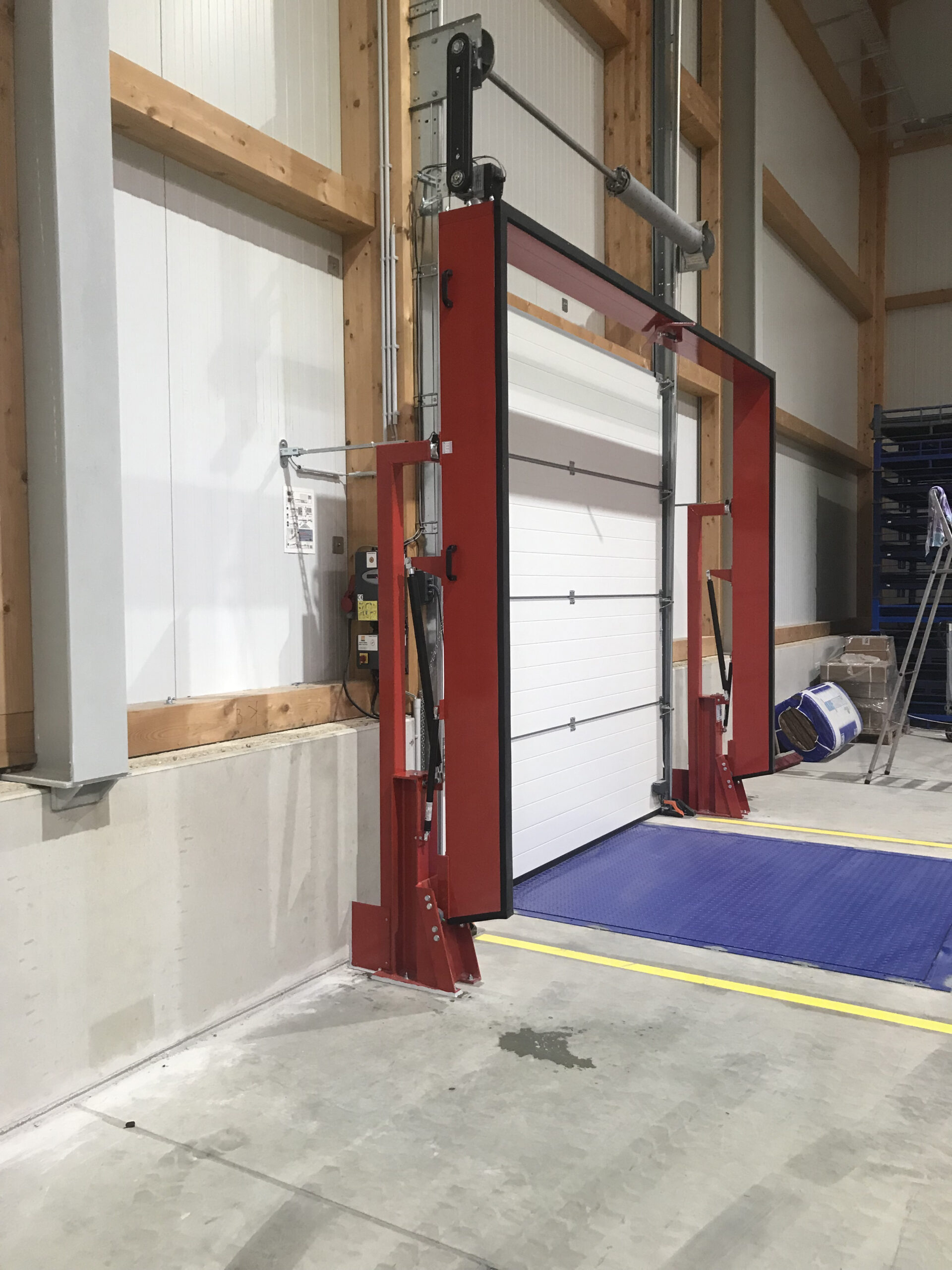 Die beiden Aufnahmehalterungen sind über Wandwinkel und Bodenschrauben zum Gebäude hin fest verbunden und abgedichtet. Auf einer der Halterungen, links oder rechts, befindet sich ein Drehlager. Vor dem Störfall, steht der Sperrkörper senkrecht auf dem Drehlager und wird durch eine Sicherungsvorrichtung gehalten. Auf der zweiten Halterung ist ein selbstsichernder Vertikalspanner montiert, mit dem die Barriere im Einsatzfall verriegelt wird.